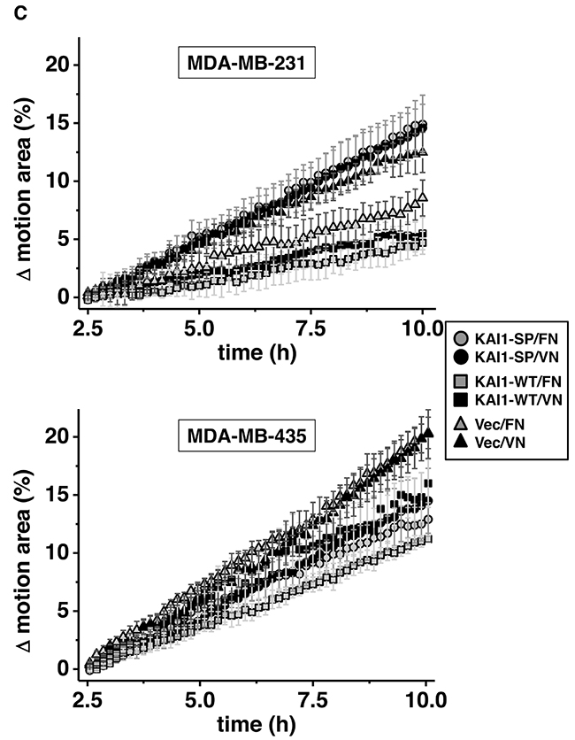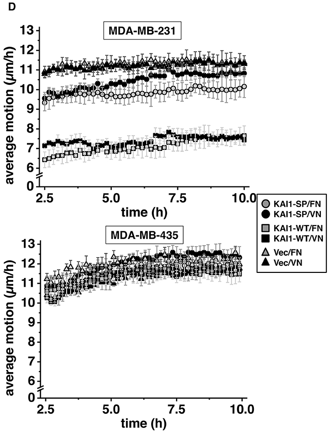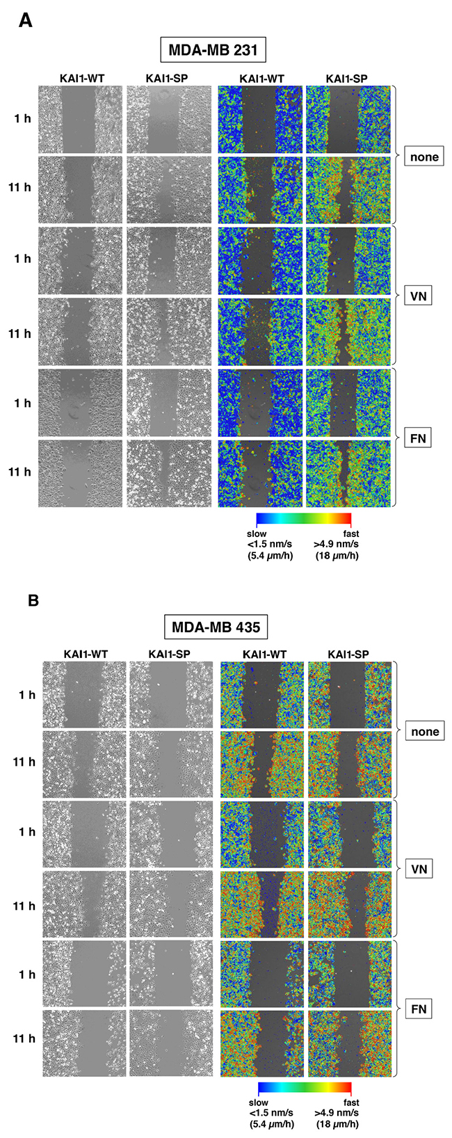 Figure 4: Effect of KAI1-WT or KAI1-SP on breast cancer cell motility. Migratory activity of MDA-MB-231 (A) and -435 (B) cells adherent to VN, FN, or non-pretreated cell culture plates was detected by wound scratch assays, using the SI8000 Cell Motion Imaging System (Sony Corporation). Shown are representative images starting 1 h after wounding of cell monolayers and after 11 h of further cell cultivation. In addition, the magnitudes of the different velocities are depicted in a blue-red color mapped overlay, indicating the highest magnitude of velocity in red and the lowest in blue. (C) Absolute change in coverage of area by cells Δ (= delta) motion area. The percentage of area coverage at time x minus the percentage of area coverage at 2.5 h after wounding was set to 0% for all variations at 2.5 h after wounding in order to ensure clear observation of the coverage variation for the different cell transfectants for the period 2.5 h to 10 h after wounding of cell monolayers. The average and standard deviation of Δ (= delta) motion area was calculated from 10 independent ROIs as described under Materials & Methods. From the gradients of linear fits of this data (2.5 h to 10 h plotted here), the closure rate over this period could be determined, for example, 2.6 μm2/h for MDA-MB-231 KAI1-WT transfectants, 6.7 μm2/h for MDA-MB-231 KAI1-SP transfectants; and 6.9 μm2/h for MDA-MB-435 KAI1-WT transfectants or MDA- MB-435 KAI1-SP transfectants, all cells being adherent to VN. (D) The average motion of the cells plotted for the same time period in the assay (2.5 h to 10 h). The cell motion varied between 6.5 and 7.5 μm/h for MDA-MB-231 KAI1-WT cell transfectants, but was faster and varied between 9.5 and 10.5 μm/h for the corresponding KAI1-SP transfectants; and even faster - between 10 and 12.5 μm/h for both KAI1-WT- and KAI1-SP-transfected MDA-MB-435 cells.