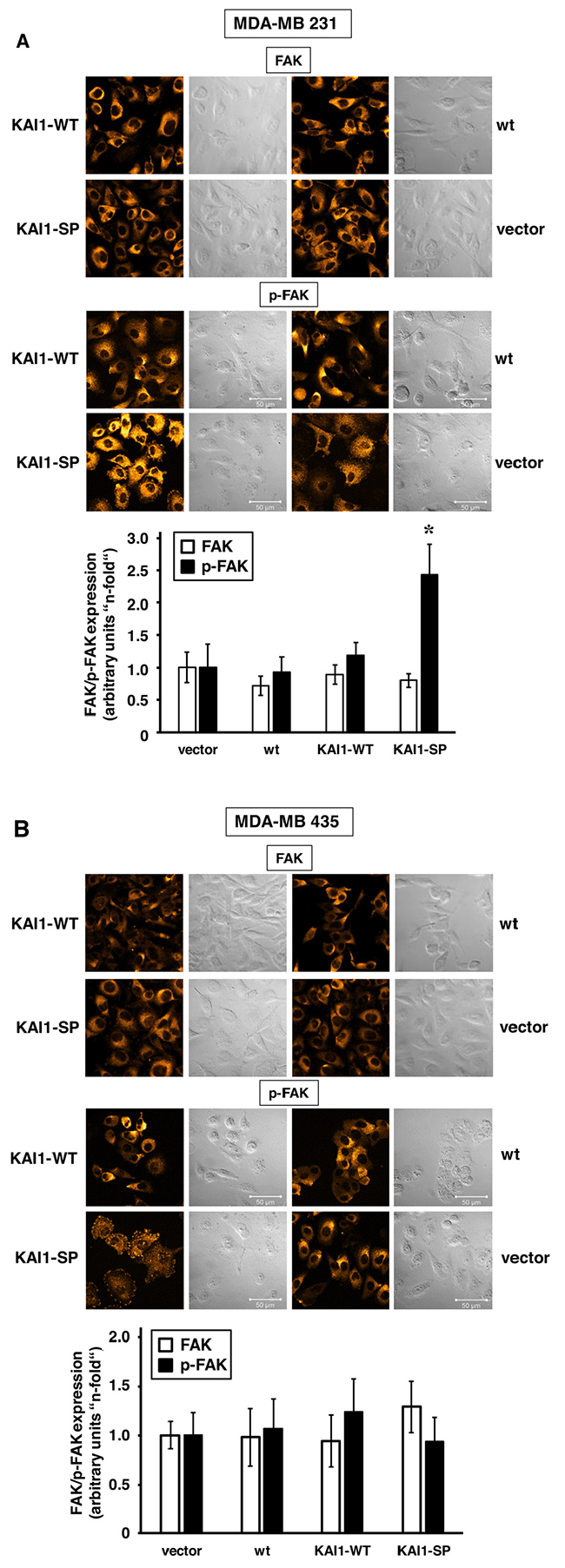 Figure 5: Immunocytochemical detection of FAK or p-FAK as a function of KAI1-WT or KAI1-SP expression. Staining procedures for FAK or p-FAK in MDA-MB-231 (A) and MDA-MB-435 cells (B) adherent to VN were conducted. Representative fluorescence CLSM images are illustrated together with the corresponding differential interference contrast images. The histogram depicts the data from the quantification of the fluorescence signal intensity of six independent ROIs within CLSM images as described under Materials & Methods. Data are given as arbitrary units (“n-fold”) by setting the values for FAK and p-FAK expression, respectively, in vector transfectants to “1”. Statistically significant differences (p <0.05) as compared to the respective vector transfectants adherent to non-pretreated cell culture dishes are indicated by an asterisk. (C) FAK and p-FAK expression was also determined in MDA-MB-231 and -435 transfectants by Western blot analysis as described. GAPDH served as control for protein loading and blotting efficiency.