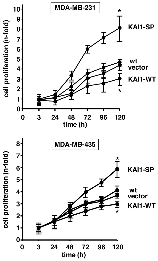 Cells were cultivated over 120 h and cell numbers counted at distinct time intervals. Cell numbers are given as `n-fold´ by setting the cell numbers of each cell transfectant at time point 3 h - when cell adhesion was fully established - to “1”. In MDA-MB-231 cells, KAI1-SP increased cell numbers by up to 8.1-fold, KAI1-WT by up to 3-fold, vector transfectants by up to 4.5-fold, which was comparable to wt cells (up to 4.3-fold). In MDA-MB-435 cells, we also noticed enhanced cell proliferation rates by KAI1-SP expression (up to 5.9-fold) as compared to KAI1-WT (2.9-fold), vector transfectants (3.8-fold), and wt cells (up to 4.1-fold) (Figure 6).