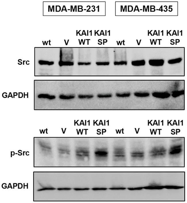 The mechanisms and signaling events underlying the role of KAI1 as a metastasis suppressor are not fully understood yet. Previously it had been reported that KAI1-WT downregulated the activation of the Src kinase [38], which also interacts with integrins, FAK, and various growth factor receptors. Since its involvement in KAI1 effects had been strongly proposed, we studied differential effects of KAI1-WT and KAI1-SP on Src expression and activation. By Western blot analysis, we found that p-Src levels significantly increased in both breast cancer cell lines as a function of KAI1-SP, whereas KAI1-WT did not alter Src kinase activation. Total Src expression levels did not change by the presence of either of the two KAI1 variants when compared to wt and vector-transfected cells (Figure 8).