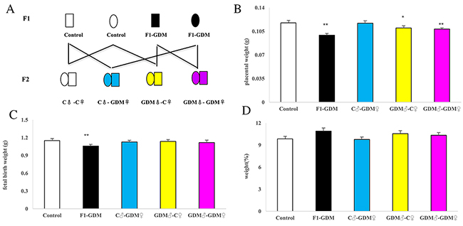 Figure 1: Experiment design, placental weight, fetal weight, fetal/placental weight of mice for control group (C), F1-GDM group, F2-GDM group. (A) Experimental design. Circles designate females and squares designate males. Note that mating pairs were non-siblings. (B) Placental weight of all five groups. (C) Fetal weight of all five groups. (D) Ratio of fetal weight over placental weight of all five groups on. In (B)-(D), data are presented as mean ± SE (n>20 mice per group).