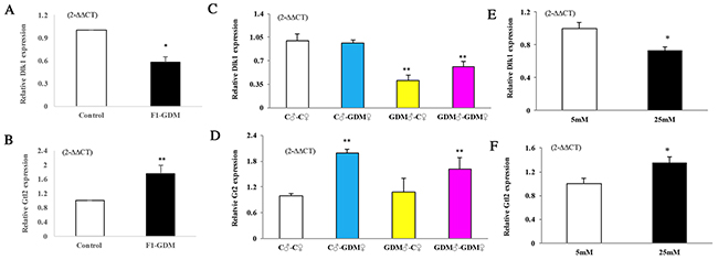 Figure 4: Dlk1, Gtl2 gene expression assessed by real-time quantitative PCR. In (A-B), Dlk1 and Gtl2 expression in placentae of F1-offspring on D18.5 (n=9 mice on for both F1-Control and F1-GDM offspring). In (C-D), Dlk1 and Gtl2 expression in placentae of F2-offspring on D18.5 (n=6 mice for every group of F2 offspring). In (E-F), Dlk1 and Gtl2 expression cultured in medium containing indicated concentrations of glucose of 24h (n=4 replicates/group) in at least three independent isolations. Data were analyzed with the Eq. 2-ΔΔCT, where ΔΔCT = ΔCT (treatment group) -ΔCT (control group), and ΔCT = ΔCT (sample) - ΔCT (internal control). The values were presented as relative expression levels of mRNA. In all panels, data are presented as mean ± SE, *P<0.05, **P<0.01. Significance was determined by Student t test in F1 offspring and ANOVA in F2 offspring.