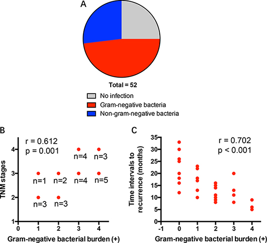 Figure 1: Gram-negative bacterial infection portends advanced disease and decreased tumor interval to recurrence in NSCLC patients. (A) A cohort of 52 NSCLC patients were screened for pulmonary infection of gram-negative bacteria. (B) The burden of gram-negative bacteria from NSCLC patients were associated with disease progression. (C) The burden of gram-negative bacteria in postoperative infection were correlated with time intervals to recurrence of NSCLC patients. Each dot represents the data from one patient.