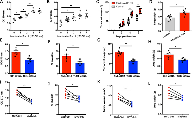 Figure 2: Gram-negative bacteria drive NSCLC progression via TLR4/MyD88 signaling. (A–B) NSCLC cells from clinical patients (n = 5) were cultured with an increasing dose of heat-inactivated E. coli. Proliferative expansion of NSCLC cells was detected after 72 hours (A). Invasion of NSCLC cells was analyzed after 24 hours (B). (C–D) NSCLC cells from 5 patients were pretreated with heat-inactivated E. coli (3x107 CFU/ml) for 24 hours and adoptively transferred into NOD-SCID mice. Tumor size was measured at the indicated time post NSCLC injection (C). Two weeks later, tumor metastasis was determined by analyzing lung weight to reflect tumor burden in lung (D). (E–H) NSCLC cells from 5 patients were transfected with TLR4 siRNA or control siRNA and incubated with heat-inactivated E. coli (3x107 CFU/ml). NSCLC growth capacity was analyzed after 72 hours (E). NSCLC invasion was detected after 24 hours (F). (G–H) 24 hours later, NSCLC were injected into NOD-SCID mice and assayed for tumor growth on day 7 (G) and tumor metastasis on day 14 (H). (I–L) NSCLC cells from 5 patients were cultured with heat-inactivated E. coli (3x107 CFU/ml) plus MyD88 inhibitory peptide (MYD-Inh, 50 μM) or control peptide (MYD-Ctrl, 50 μM). Tumor progression in vitro and in vivo were analyzed as described above. Each dot represents the data from one individual. *p < 0.05. **p < 0.01.