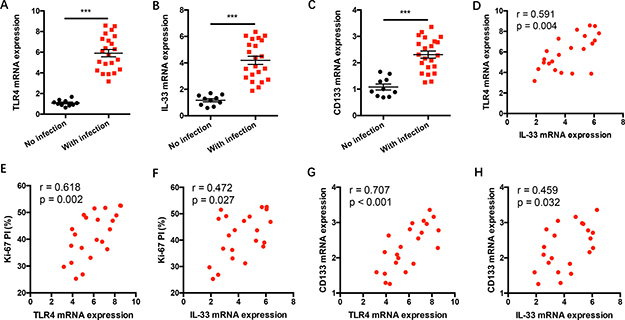 To investigate the in vivo relevance of TLR4 signaling with IL-33 expression and NSCLC progression in clinical patients, NSCLC tissues with or without gram-negative bacterial infection were analyzed for TLR4, IL-33 and CD133 expressions. We observed higher TLR4, IL-33 and CD133 expressions in NSCLC patients with gram-negative bacterial infection (Figure 6A–6C). TLR4 expressions were closely correlated with IL-33 expressions in gram-negative bacterial infected patients (Figure 6D). Of note, TLR4 and IL-33 expressions were positively associated with Ki-67 proliferative index (PI) and expressions of CSC-related gene CD133 in NSCLC patients with gram-negative bacterial infection (Figure 6E–6H).