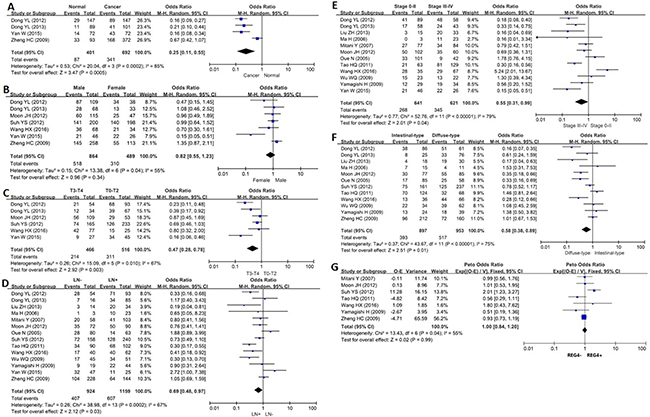 Figure 2: Forest plot for the relationship between REG4 expression and clinicopathological parameters of gastric cancer. (A) gastric carcinogenesis (cancer vs normal mucosa); (B) correlation between sex and REG4 expression (male vs female); (C) correlation between depth of invasion and REG4 expression (T0-2 vs T3–4); (D) correlation between lymph node metastasis (LN) and REG4 expression (LN- vs LN+); (E) correlation between TNM staging and REG4 expression (stage 0-II vs III-IV); (F) correlation between differentiation and REG4 (intestinal-type vs diffuse-type). (G) correlation between the prognosis and REG4 expression (REG4- vs REG4+).