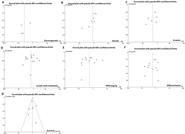 Figure 3: Funnel plot for publication bias test between REG4 expression and gastric carcinogenesis or progression. The bias was analyzed about risk degrees of REG4 expression in gastric mucosa (A) for gastric carcinogenesis. Additionally, it was tested between REG4 expression and clinicopathological features of gastric cancer, including age (B), depth of invasion (C), lymph node metastasis (D), TNM staging (E), and differentiation (F) and prognosis (G).