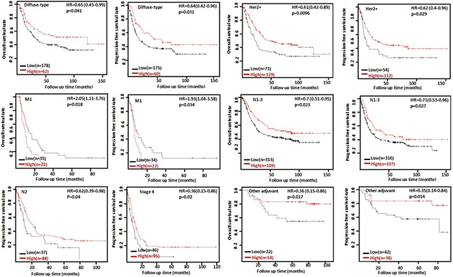 Figure 5: The prognostic significance of REG4 mRNA in the patients with gastric cancer. According to the data from Kaplan-Meier plotter, REG4 mRNA expression was positively related to either overall or progression-free survival rate of the patients with gastric cancer except M1 cancer. HR, hazard ratio.