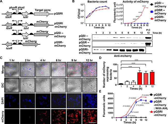 Figure 1: Expression of mCherry reporter gene in ∆ppGpp Salmonella carrying pQSRI-mCherry, pQSI-mCherry, or pQSR-mCherry during growth in vitro. (A) Plasmid constructs carrying mCherry under control of various combinations of QS elements, LuxR, and/or LuxI. (B) Bacterial growth (CFU/ml) in LB as a function of time (hours, h) (left panel). Expression of mCherry from bacteria grown in LB, as determined by fluorometry (right panel) and by Western blotting (bottom panel). For detection of mcherry, we used 20μg of purified protein for each sample. Positive control (P.C) is the sample of PQSRI-mcherry (12 hr). (C) Salmonella carrying the pQSRI-mCherry, grown in LB as shown in (Figure 1B, left panel), were sampled at the indicated time, stained, and imaged under a fluorescence microscope. Blue indicates DAPI staining and red indicates mCherry. Differential interference contrast (DIC) microscopic images of Salmonella are included. Scale bar, 10 μm. (D) mCherry-expressing Salmonella were quantitated ( > 5 fields per sample) visually and plotted as a function of culture time. (E) Expression of mCherry by ∆ppGpp Salmonella carrying pQSRI-mCherry or pQSR-mCherry supplemented with or without AHL in LB, as determined by fluorometry. Salmonella carrying pQSR-mCherry were included as a control. Asterisks (*) in panels B and D indicate significant differences compared to pQSI-mCherry (***P < 0.0001).