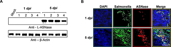 Figure 6: In situ expression of L-ASNase by quorum-sensing promoter in a mouse tumor model. Expression of L-ASNase in mice treated with Salmonella carrying pQSRI-ASNase was analyzed at 1 and 5 dpi by Western blotting (n = 4 for each group, (A) or by immunofluorescence microscopy (80× magnification) (B). Green indicates Salmonella and red indicates L-ASNase. Scale bar, 50 μm.