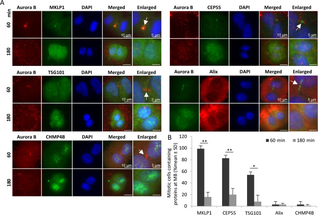 Figure 1: Midbody proteins disappear with time in non-adherent fibroblasts. BJ cells in mitotic phase were isolated and incubated in non-adhesive dishes for 60 and 180 minutes. (A) Representative immunofluorescence micrographs illustrating the distribution of selected midbody (MB) proteins at the intercellular bridge region (identified by Aurora B labelling; marked by an arrow in the enlarged pictures). Nuclei were stained with DAPI (blue). (B) Mean % ± SD of the number of cytokinetic cells containing the analysed proteins in the midbody region.
