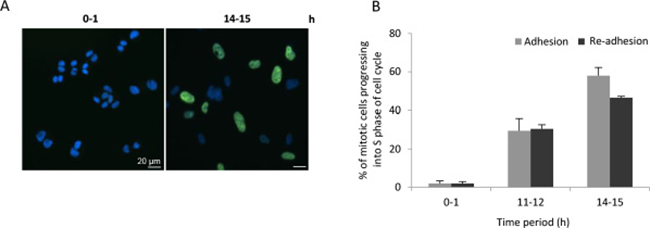To investigate if abscission by mechanical rupture affected the functionality of the cells, the ability to proceed in the following cell cycle into S phase was tested. Mitotic cells were isolated and cultured in suspension for 3 hours as in the previous experiments, plated on fibronectin-coated coverslip for different time periods, and then incubated with the nucleotide analogue EdU during an additional hour on fibronectin. For comparison, mitotic cells continuously cultured on fibronectin was given EdU at the same time periods. In both culture conditions, almost no cells exhibited EdU-labelled nucleus during the first hour after isolation, but after 12 hours (3 hours suspension culture followed by adhesion for 9 hours) the number of EdU-positive cells gradually increased at a similar rate in cells re-plated on fibronectin and continuously adherent control cells (Figure 4A, 4B).