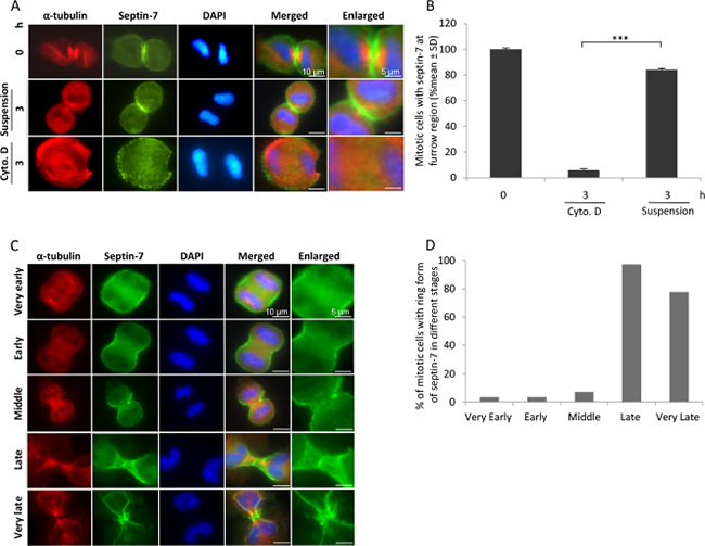 Figure 6: Septin-7 stabilises the ingressed plasma membrane. (A) BJ cells were synchronized with CDK1 inhibitor and then isolated mitosis cells were incubated on fibronectin for 15 minutes (0 h), in suspension for 3 hours, or on fibronectin for 3 hours in the presence of cytochalasin D. Representative immunofluorescence images showing the distribution of septin-7 (green) and α-tubulin (red). (B) Mean% ± SD of the mitotic cells having septin-7 at the cleavage furrow under the different culture conditions described in (A). (C) Representative immunofluorescence images illustrating the septin-7 localization during different stages of cytokinesis. Mitotic BJ cells were immunostained for septin-7 (green) and α-tubulin (red), and nuclei were stained with DAPI (blue). (D) % of mitotic cells with septin-7 ring structure during different cytokinetic stages as shown in (C).