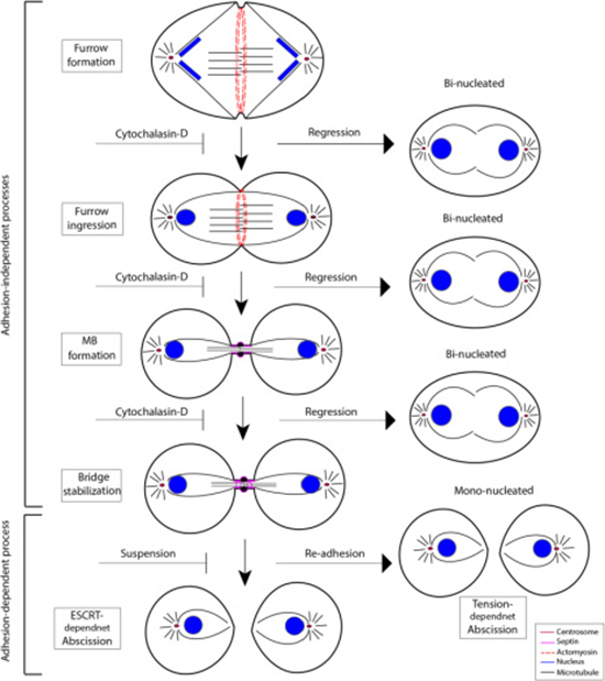 Figure 7: A model describing the effects of cytochalasin D and adhesion on cytokinesis and furrow regression. The cytokinesis process is regressable after cytochalasin D treatment until the late stage in which the intercellular bridge is stabilized, possibly by septin filaments; the regression results in the generation of bi-nucleated cells. In cells where the normal ESCRT-mediated abscission fails, abscission can still be completed by migration-mediated traction on the intercellular bridge.