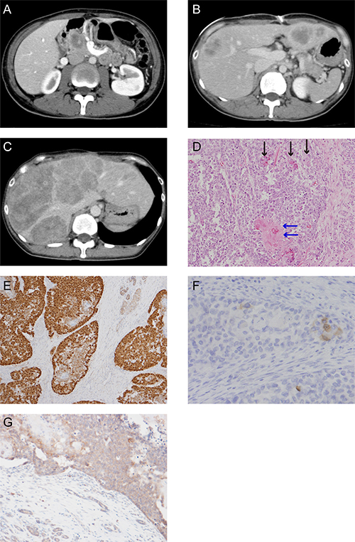 Figure 1: CT scan images and histological appearance of this case. (A) CT scan image at first visit. (B) CT scan image at postsurgical recurrence of liver metastasis. (C) The last CT scan image before the patient died. (D) Hematoxylin and eosin staining (magnification, ×200). The black arrow shows the squamoid nest and the blue arrow shows the squamoid nest with keratinization. (E) Immunohistochemical staining for β-catenin (magnification, ×100). (F) Scattered tumor cell shows positive for Bcl-10 (magnification, ×200). (G) Immunohistochemical staining for APC (magnification, ×50).