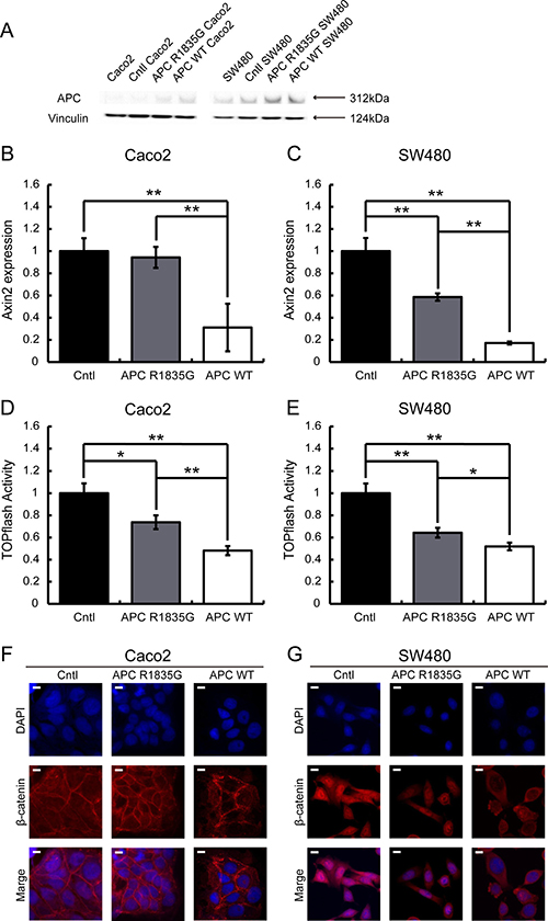 Figure 3: Evaluation of the suppression ability of the Wnt/β-catenin signaling pathway using a stable transformant. Western blotting analysis of APC in Caco2 and SW480 cells with three genotypes (APC-WT, APC-R1835G and Cntl) were shown (A). Relative expression level of AXIN2 mRNA with three genotypes in Caco2 (B) and SW480 (C) cells and activity of the TOPFlash assay with three genotypes in Caco2 (D) and SW480 (E) cells were indicated. Vertical axis of the result (B) and (C) shows relative AXIN2 expression and (D) and (E) show relative TOPflash activity. Data are shown as the mean ± SD, *p < 0.05 **p < 0.01 (Student’s t-test), and all assays were performed in triplicate. Immunofluorescence of β-catenin with three genotypes in Caco2 (F) and SW480 (G) cells were shown. Scale bar shows 10 μm.