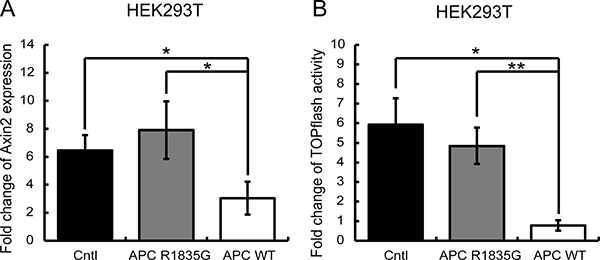 Figure 4: Evaluation of the suppressive ability of the Wnt/β-catenin signaling pathway under the condition of external Wnt signaling stimuli. (A) Relative expression levels of AXIN2 mRNA with three genotypes in HEK293T (APC-WT-HEK293T, APC-R1835G-HEK293T, and Cntl-HEK293T) cells are shown. (B) Activities of the TOPFlash assay with three genotypes in HEK293T were indicated. Vertical axis of result (A) shows fold change of AXIN2 expression and the result (B) shows fold change of TOPflash activity before and after LiCl stimulation. Data are shown as the mean ± SD, *p < 0.05 **p < 0.01 (Student’s t-test), and all assays were performed in triplicate.