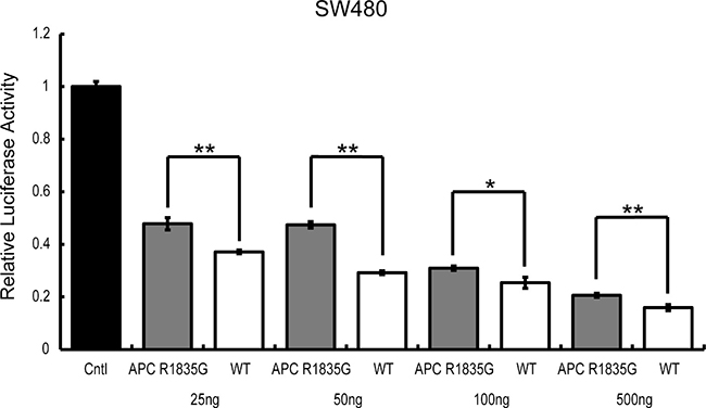 Figure 5: TOPFlash reporter activity by APC-R1835G expression levels in SW480. TOPflash activity was assessed after transfection of pCMV-Neo-Bam APC-R1835G and pCMV-Neo-Bam APC in SW480 cells. Each plasmid is transfected at 25 ng, 50 ng, 100 ng, and 500 ng. Data are shown as the mean ± SD, *p < 0.05 **p < 0.01 (Student’s t-test), and all assays were performed in triplicate.