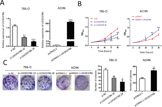 Figure 2: LOC653786 promotes RCC cell growth. 786-O and ACHN cells were separately transfected with the indicated siRNAs and expression plasmids for 48 h, then the level of LOC653786 was examined by qPCR (A), the cell viability was determined by CCK-8 assay(B), and the colony-forming ability was detected by colony formation assay (C). *P<0.05, **P<0.01, ***P<0.001.