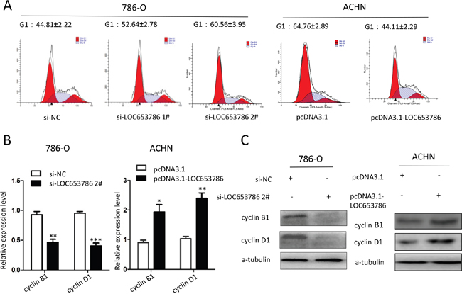 Figure 3: LOC653786 accelerates cell cycle progression of RCC cells. 786-O and ACHN cells were separately transfected with the indicated siRNAs and expression plasmids for 48 h, then the cell cycle was analyzed with flow cytometry (A), and the mRNA and protein levels of cyclin D1 and cyclin B1 were detected by qPCR (B) and Western blot (C). *P<0.05, **P<0.01, ***P<0.001.