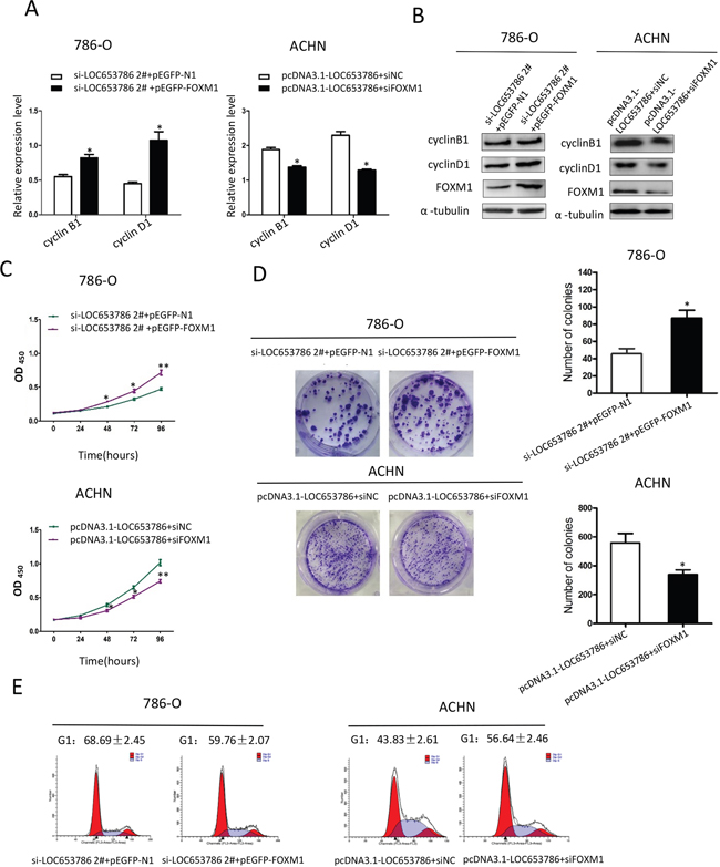 Figure 5: LOC653786 promotes RCC cell growth and cell cycle progression through elevating FOXM1. (A–E) 786-O and ACHN cells were separately cotransfected with the indicated siRNAs and expression plasmids for 48 h, and then the indicated target molecules were examined by qPCR (A) and Western blot (B), the cell viability was determined by CCK-8 assay(C), the colony-forming ability was measured by colony formation assay (D), and thecell cycle was analyzed by flow cytometry (E). *P<0.05, **P<0.01.