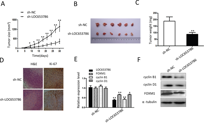Figure 6: Knockdown of LOC653786 represses RCC xenograft growth and FOXM1 expression in vivo. (A–F) Six-week-old male nude mice were randomly divided into two groups (n=6 per group). Then sh-LOC653786 cells (786-O cells with LOC653786 stable knockdown) and sh-NC cells (786-O cells with stable expression of shNC) were separately injected subcutaneously into the right flanks of mice (5×106 cells per mouse). Subsequently, the xenograft tumor size was monitored every 3 days, and the tumor volume was calculated using the formula ‘volume = width2×length×1/2’ (A). Thirty days later, the mice were sacrificed, and the RCC xenografts were excised for photographing (B) and weighting (C). The level of Ki-67 in the xenograft tumors was detected by IHC staining (D), and the indicated molecules were examined by qPCR (E) and Western blot (F). *P< 0.05, **P< 0.01.