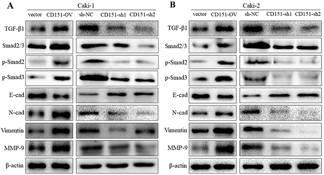 Figure 3: Regulation of CD151 on EMT, MMP-9 and TGF-β1 signaling. Western blot analysis was used to detect the changes in MMP-9, TGF-β1 and EMT-related protein expression after transfection of lentiviral vector. (A) In Caki-1 cell line, E-cad was decreased while TGF-β1, p-Smad2, p-Smad3, N-cad, Vimentin and MMP-9 were increased in CD151-OV group cells. The results were opposite in CD151-sh1/2 group cells. (B) In Caki-2 cells, the similar results were detected. *P < 0.05 compared with the negative control group.