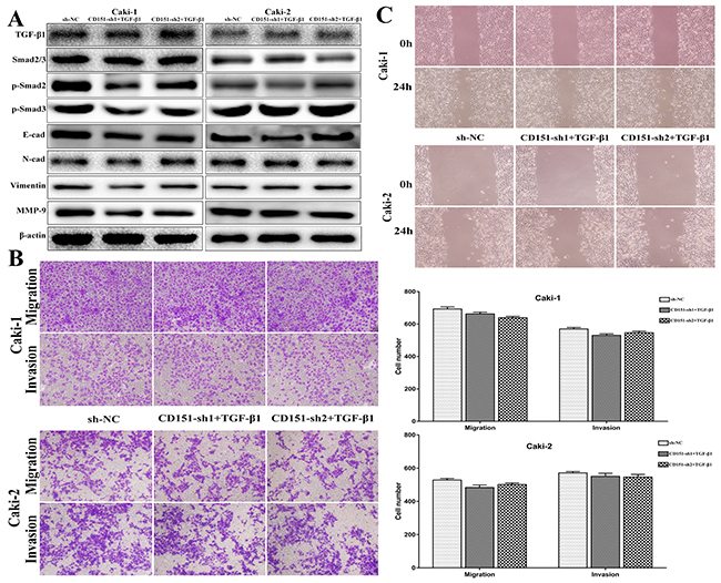 Using the transwell assays, decreased migration and invasion capability of Caki-1 and Caki-2 cells induced by CD151 downregulation was reversed after Rh TGF-β1 motivating. The results showed no significant difference between NC group and sh+TGF-β 1 group (p > 0.05, Figure 4B).