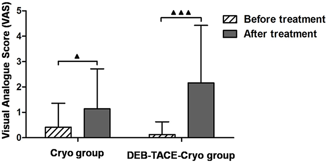 From a safety aspect, the postoperative complications of the two groups were classified as grade 1 or 2 according to the CTCAE V4.0 standard, neither of which is considered to be very severe. There was no significant difference in the incidence of complications between the two groups(P > 0.05), which showed that combination therapy did not cause the superposition effects or increases incidence rate of complication. Notably, according to the liver function results in this study, the serum ALT levels in the two groups and the T.BIL in the DEB-TACE-Cryo group increased during the first 7 days. However, there was no significant increase recorded 30 days after treatment. This indicates that neither treatment approach resulted in long-term liver function effects and that both the combined therapy and cryoablation alone are safe for unresectable HCC treatment.