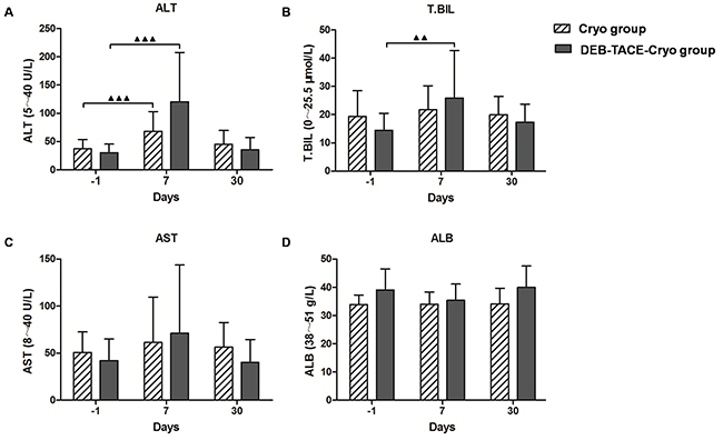 Seven days after treatment, the serum alanine aminotransferase (ALT) levels of both the DEB-TACE-Cryo and the Cryo groups and serum total bilirubin (T.BIL) in the DEB-TACE-Cryo group had increased during the short-term (P = 0.008, P = 0.002, and P = 0.016, respectively). Interestingly, there was no significant increase recorded for any of these levels 30 days after treatment. No obvious changes in aspartate aminotransferase (AST) or albumin (ALB) levels were observed after treatment (Figure 4).