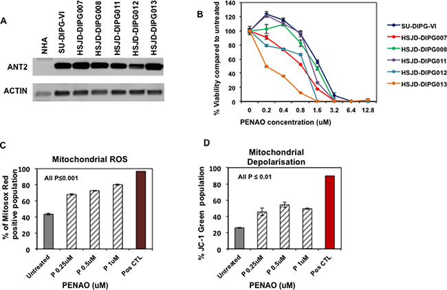 Figure 1: ANT2 is a potential therapeutic target for DIPG. (A) Representative western blot image of ANT2 protein in a panel of DIPG cells and normal astrocytes (NHA); (B) Cytotoxic efficacy of PENAO tested for 72 h against a panel of neurosphere-forming DIPG cells. Viability was assessed by resasurin assay and presented as a percentage viability compared to untreated cells; Experiment was replicated 3 times; (C) Flow cytometric analysis of HSJD-DIPG007 cells for production of mitochondrial ROS. DIPG cells were treated with increasing concentration of PENAO (P) for 18 h and subsequently stained with MitosoxRed and analysed with FACS Canto B. Data represent average and SD of 3 determinations; untreated vs PENAO p < 0.001 for all concentrations tested; For positive control DIPG cells were treated with 100 uM antimycin for 1 h and analysed. (D) Flow cytometric analysis of HSJD-DIPG007 cells for mitochondrial depolarisation. DIPG cells were treated with increasing concentration of PENAO for 18 h and subsequently stained with JC1 and analysed with FACS Canto B. Data represent average and SD of 3 determinations; untreated vs PENAO p < 0.01 for all concentrations tested. For positive control DIPG cells were treated with 50 uM CCCP for 2 h and analysed.