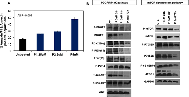 Figure 2: PENAO induces apoptotic cell death and affects major oncogenic pathways in DIPG cells. (A) Flow cytometric analysis of HSJD-DIPG007 cells for apoptotic cell death. HSJD-DIPG007 cells were treated with increasing concentration of PENAO (P) for 42 h and subsequently stained with AnnexinV-FITC and 7AAD and analysed with FACS Canto B. Data represent average and SD of 3 determinations; untreated vs PENAO p < 0.01 for all concentrations tested. (B) Representative western blot images of key players involved in RTK/PI3K/mTOR pathway in HSJD-DIPG007 cells treated with PENAO as a function of time. DIPG cells were treated with 3 μM of PENAO for 24 h, 48, 72 h and subsequently lysed pellets were examined by western blotting.