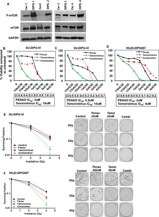 Although mTOR has been suggested to play a fundamental role in gliomagenesis, it has not been previously reported to be upregulated in DIPGs compared to normal tissue. DIPG tissue from pediatric patient autopsies revealed higher phosphorylated mTOR levels compared with matched normal cerebellum (Figure 3A). Since PENAO influences mTOR and its downstream targets, we next sought to investigate whether the cytotoxic efficacy of PENAO could be enhanced with the mTORC1-specific inhibitor, temsirolimus. We found that temsirolimus dramatically enhanced the cytotoxic potential of PENAO on a variety of DIPG cells with combination indices indicating potent synergy at most of the concentrations tested (Figure 3B–3D). A similar synergistic effect was seen with other mTORC1 inhibitors such as rapamycin and everolimus (Supplementary Figure 3). Given that radiotherapy is the only current standard treatment available for DIPG patients, we therefore examined whether the combination of PENAO with temsirolimus could be enhanced with addition of irradiation. We performed soft-agar assays and found the clonogenic potential of DIPG cells was significantly impaired with the combination of temsirolimus and PENAO at nanomolar concentrations. This effect was further potently enhanced with the addition of irradiation in two primary DIPG neurosphere cultures (Figure 3E–3F). These data demonstrate that the clonogenic and proliferative nature of DIPG cells is severely impaired with combination of both agents, and that this combination can be further enhanced with irradiation.