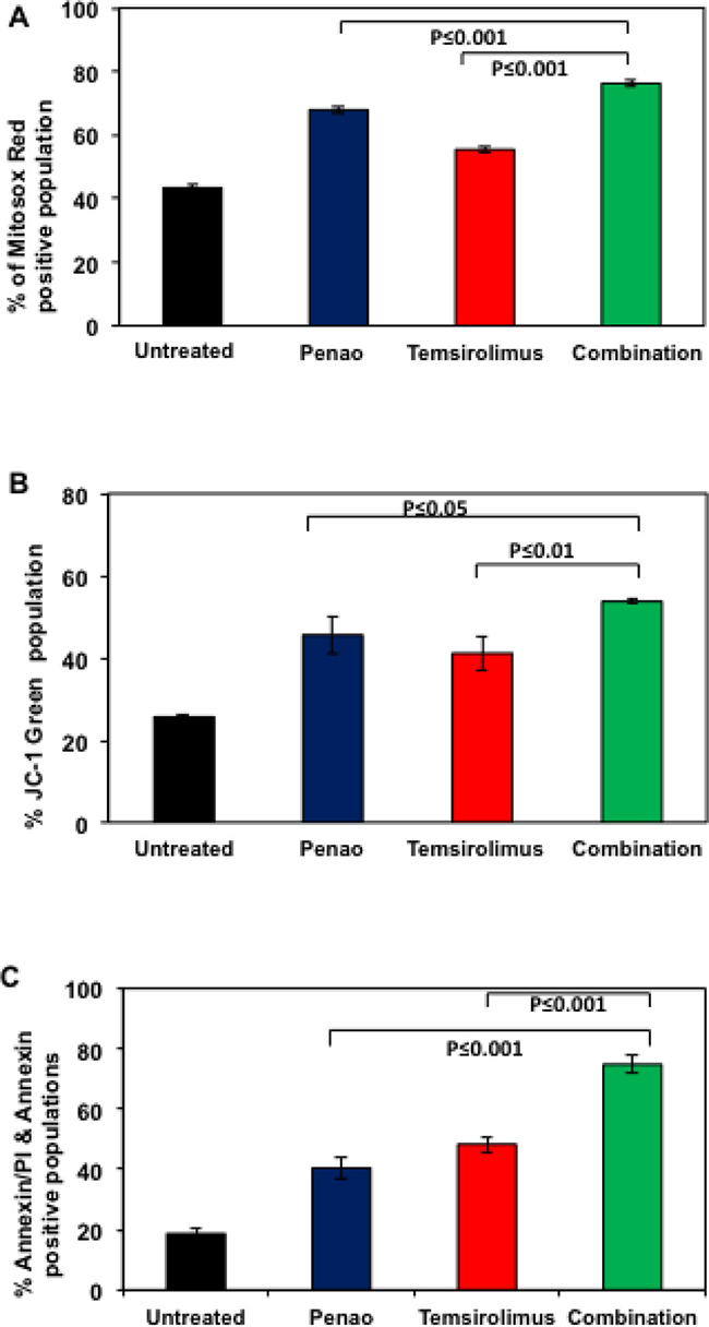 We next sought to test whether combination treatment with PENAO and temsirolimus further affects mitochondrial function and whether it enhances apoptotic cell death. Although mTOR inhibitors are known to promote autophagy and subsequent programed cell death, it has also been shown that mTOR inhibition could also affect mitochondrial function [26, 27]. We confirmed, using flow cytometric analysis, that temsirolimus promotes ROS production and membrane depolarisation (Figure 4A–4B). In addition, the combination of PENAO with temsirolimus led to a further significant increase in both parameters. As shown in Figure 4A mitochondrial ROS production increased from 67.5% and 55.4% for PENAO and Temsirolimus respectively as single agents, to 76.2% for the combination treated cells. Mitochondrial depolarisation also increased from 45.5% (PENAO) and 41% (Temsirolimus) to 53.7% for combination treated cells. We next examined whether the combination treatment could also enhance apoptotic cell death. Similar to effects seen on proliferation and clonogenic ability, the combination of PENAO and temsirolimus was also found to significantly enhance apoptotic cell death from 40.4% and 48% for PENAO and Temsirolimus respectively as single agents to 74.8% for combination treated cells (Figure 4C).