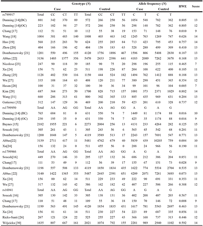 Data were extracted from all eligible studies by two investigators (Gui-Ping Xu and Qing Zhao) working independently. Disagreements were resolved via discussion. The following information was extracted: name of first author, year of publication, country, cancer type, ethnicity, genotyping methods, source of controls, genotype distributions of cases and controls, and Hardy-Weinberg equilibrium (HWE) for controls. One of the studies only provides the percentage of each genotype, the complete data were obtained from the author [32].