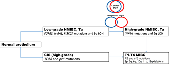 Non-muscle invasive bladder cancer (NMIBC) is subdivided into 2 unique groups on the basis of observed phenotypic appearance. The first group, low grade noninvasive (Ta) UCB have a typical papillary appearance and recur frequently with a small percentage progressing to a higher stage. These tumors are characterized by oncogenic mutations in FGFR3, H-RAS, and PI3KCA [2, 12]. High-grade papillary lesions are typified by deletions in chromosome 9q and mutations in INK4A and have an increased rate of progression to invasive disease in comparison to low-grade disease [2]. The second group consists of carcinoma in situ (CIS), a high-grade lesion characterized by TP53 and p21 mutations with a 60-80% progression rate to invasive disease involving RB and p16 (T1-T4) [2]. A visualization of this is shown in Figure 6.