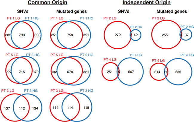 Figure 3: Venn diagrams of overlapping mutations in patients with grade progression.