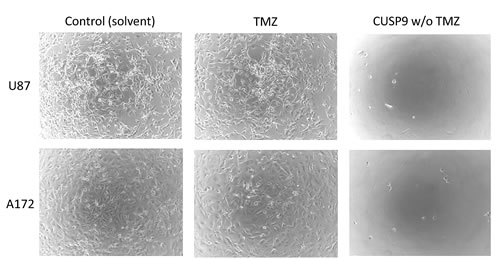 Fig. 1: In vitro activity of CUSP9 drugs compared to that of temozolomide alone. The cell-killing effects of CUSP9 without temozolomide versus temozolomide alone on glioblastoma cell lines in vitro. Two different glioblastoma cell lines were incubated with CUSP9 compounds without temozolomide (TMZ) or with TMZ alone at the respective concentrations commonly achievable in human plasma or cerebrospinal fluid (if the latter data were available). Control cells were treated with the corresponding amount of solvent only. Microphotographs were taken after 7 days of continuous exposure to CUSP9, TMZ, or solvent respectively. While glioblastoma cells grew rapidly under control conditions, all CUSP9 without TMZ-treated cells had died. In comparison, TMZ conferred a markedly weaker inhibition of cell growth.