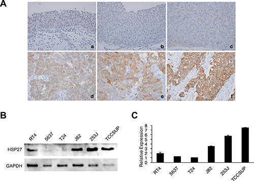 Figure 2: Protein expression of HSP27 in human bladder cancer (BC) tissues and cell lines. (A) Representative images of HSP27 immunohistochemistry in human BC tissues (magnification, 400×). a. normal urothelium, b. negative expression in low-grade non-muscle-invasive BC (NMIBC), c. negative expression in high-grade NMIBC, d. mild expression in high-grade NMIBC, e. moderate expression in high-grade NMIBC, f. strong expression in high-grade muscle-invasive BC. (B–C) Total HSP27 protein expression in various BC cell lines was analyzed by western blotting. GAPDH was used as a calibration control. Representative western blots (B). Relative expression was quantified using ImageJ software and is presented in a bar graph (C).
