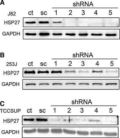 Figure 3: shRNA-mediated knockdown of HSP27 in BC cells. BC cells were transfected with HSP27 shRNAs by lentivirus infection. shRNA-transfected J82 (A), 253J (B), and TCCSUP cells (C) were isolated by 3 weeks of puromycin selection, and HSP27 expression in each cell line was analyzed by western blot. GAPDH was used as a housekeeping protein control. ct: non-transfected control; sc: scramble shRNA; shRNA: shRNA against HSP27.