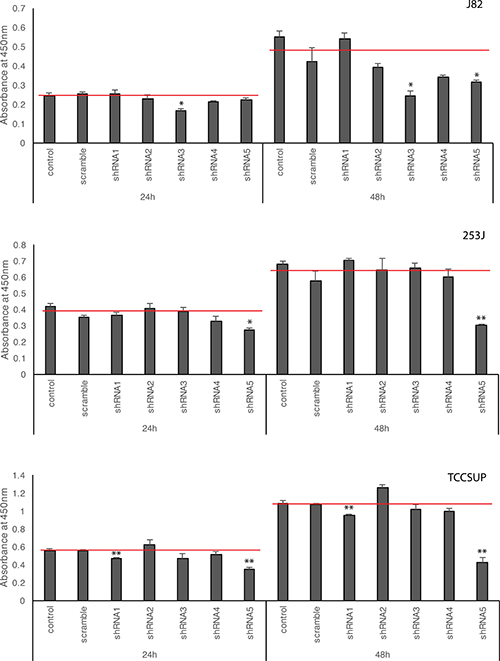 Figure 4: Effects of HSP27 knockdown on BC cell proliferation. The same numbers of shRNA-transfected BC cells were seeded onto a 96-well culture plate. The proliferation of BC cells transfected with shRNA as measured by WST-1 assay at 24 and 48 h. ct: non-transfected control, scramble: scramble shRNA, shRNA1-5: shRNA for HSP27. *p < 0.05, **p < 0.01, Student’s t-test. Red lines in the graph indicate mean value of BC proliferation after transfection of control and scramble shRNA plasmid.