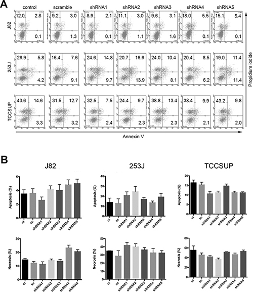 To analyze the effect of HSP27 knockdown on BC cell proliferation, a WST-1 cell proliferation assay was performed after five shRNA transfections in the three BC cell lines (Figure 4). In J82, shRNA3 and shRNA5 significantly inhibited cell growth. shRNA1, which had a weak suppressive effect on HSP27 expression, did not show any effect on proliferation. shRNA2 and shRNA4 slightly inhibited BC cell growth, but this effect was not significant. In 253J, only shRNA5 showed significant inhibition of proliferation. In TCCSUP, only shRNA1 and shRNA5 inhibited proliferation significantly; however, other shRNAs also showed obvious suppression of HSP27 expression (Figure 3C). Taken together, only shRNA5 for HSP27 showed consistent inhibition of cell proliferation in the three BC cell lines; therefore (integrating Figure 3 and Figure 4), it was difficult to conclude that silencing of HSP27 has an anti-proliferative effect on BC cells. Because a previous study indicated that OGX-427 treatment induced apoptosis in UMUC-3 BC cells [19], we also analyzed apoptosis and cell death. However, in our normal culture conditions, all shRNA-transfected BC cells were healthy and only a few dead cells were observed. Therefore, we analyzed apoptosis in BC cells cultured with serum-free media for 48 h (Figure 5). Although a few shRNA-knockdown BC cells showed more apoptosis or necrosis than scramble shRNA-treated BC cells, we found no significant and consistent effect on the viability of HSP27-knockdown BC cells.