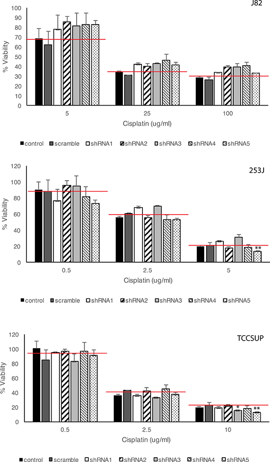 Figure 6: Effects of HSP27 knockdown on cisplatin-induced BC cell death. ShRNA-transfected BC cells were incubated with various concentrations of cisplatin for 48 h. Cell viability was analyzed by WST-1 assay. ct: non-transfected control, scramble: scramble shRNA, shRNA1-5: shRNA for HSP27. *p < 0.05, **p < 0.01, Student’s t-test. Red lines in the graph indicate mean value of BC cell viability after transfection of control and scramble shRNA plasmid.