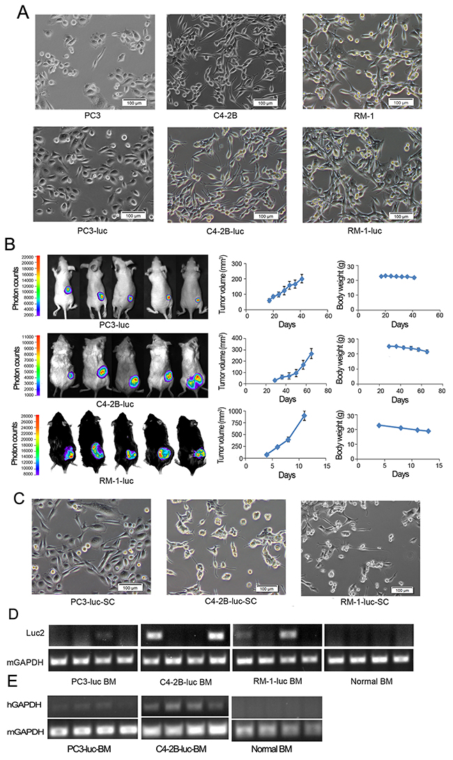 The mice were sacrificed at the endpoint. After sacrifice, the main organs of each mouse, including the lung, heart, liver, and kidney, were checked for metastatic foci; no metastatic tumors were found. Then, the xenograft tumors were harvested, and single cell suspensions were cultured with appropriate medium in a CO2 incubator. The ex vivo tumor cells were named PC3-luc-SC, C4-2B-luc-SC and RM1-luc-SC respectively. The morphology of the PC3-luc-SC, C4-2B-luc-SC and RM1-luc-SC cells had changed significantly compared with the cells growing in vitro (Figure 1C). To test whether the tumor cells had disseminated to the bone marrow, the ilium, femur and tibia were collected and bone marrow cells were flushed using PBS. Total RNA was extracted from the bone marrow cells and analyzed using RT-PCR. The results showed that part of mice expressed luc2 in their bone marrow cells (Figure 1D). Further, we observed that most bone marrow samples from PC3 or C4-2B tumor-burden mice were detected human GAPDH expression (Figure 1E). These results suggest that some tumor cells have spread to the bone, which supports our hypothesis that tumor cells may move to distant organs at the tumor initiation stage.