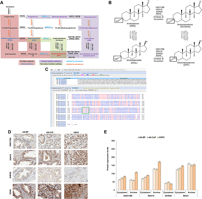 Figure 1: HSD17B6, RDH16, DHRS9 and RDH5 expression in AS-BP, AS-CaP and CRPC. Androgen metabolism pathways for DHT synthesis (A). Diagram of 3α-oxidoreductase activity (B). COBALT 3α-oxidoreductase protein sequence alignment with the catalytic site highlighted (green box) (C). IHC of four endogenous 3α-oxidoreductases in AS-BP, AS-CaP and CRPC (D). Positive and negative control images were shown in Supplementary Figure 1. Scores showed that HSD17B6 and RDH16 were expressed at higher levels in CRPC than ASBP or AS-CaP tissue (E). Data were presented as the mean +/- SEM. Protein expression was modeled as a function of tissue type (AS-BP, AS-CaP or CRCP), compartment (cytosol or nuclear), their interaction, and a random rater effect using a linear mixed model (LMM). Mean expression was compared among tissue types and between compartments using Tukey-Kramer adjusted tests about the least square means. P-values were listed in Supplementary Table 4.