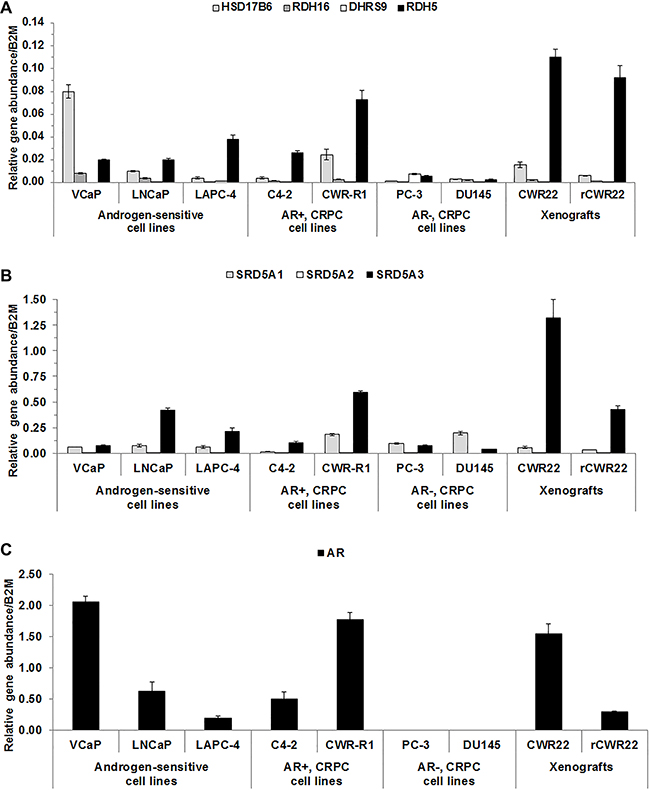 Figure 2: 3α-oxidoreductases were expressed in CaP cell lines and xenografts. qRT-PCR results were shown for 3α-oxidoreductase (A), SRD5A (B), and AR (C) mRNA levels for CaP cell lines and CWR22 and rCWR22 xenografts. Data were presented as mean +/- SEM. Gene expression was modeled as a function of cell line and a random replicate effect using a LMM. Mean expression was compared among cell lines using Tukey-Kramer adjusted tests about the least square means.