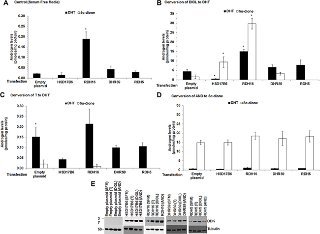 Figure 3: DHT levels increased when RDH16 was expressed in LAPC-4 cells. Androgen levels were measured using LC-MS/MS from media and cell pellets of LAPC-4 cells transfected with empty plasmid or expression plasmids encoded with HSD17B6, RDH16, DHRS9 or RDH5. Media and cell pellet androgen levels were combined. Cells were treated for 12 h in SFM alone (A) or SFM with 20 nM DIOL (B) or 1 nM T (C) or 20 nM AND (D). Western blot analysis using DDK antibody was used to confirm enzyme expression (E). Western blot images were cropped to conserve presentation space. Data were presented as mean +/- SEM. Androgen levels were modeled as a function of treatment (SFM, DIOL, T or AND), enzyme (HSD17B6, RDH16, DHRS9 or RDH5), and their interaction using a general linear model (GLM). Mean androgen levels were compared among DIOL, T or AND treated LAPC-4 cells against SFM treated LAPC-4 cells for each analyte. Comparisons were made among LAPC-4 cells that expressed each 3α-oxidoreductase and LAPC-4 cells with empty plasmid for each treatment using Dunnett adjusted post-hoc tests. P-values were reported in Supplementary Table 6. *p < 0.05.