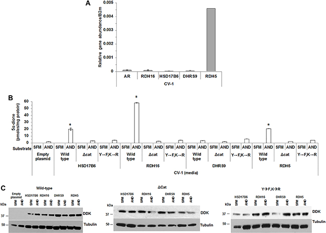 Figure 4: Mutation of conserved residues impaired 3α-oxidoreductase activity. CV-1 cells were analyzed for 3α-oxidoreductase gene expression (A). 5α-dione levels were measured in CV-1 cells that transiently expressed wild-type HSD17B6, RDH16, DHRS9 or RDH5 wild-type 3α-oxidoreductases catalytic site deletion mutant (Δcat) or double mutant (Y→F, K→R) (B). Transient 3α-oxidoreductase expression was confirmed using western blotting with DDK antibody (C). Western blot images were cropped to conserve presentation space. Data were presented as the mean +/- SEM. Mean media androgen levels were compared between AND or SFM treated CV-1 cells using one-sided Tukey-Kramer adjusted Welch-Satterthwaite T-tests; corresponding P-values were listed in Supplementary Table 6. Media androgen levels of AND treated CV-1 cells were modeled as a function of enzyme (HSD17B6, RDH16, DHRS9 or RDH5, or empty plasmid), plasmid type (wild-type, Y→F, K→R or Δcat 3α-oxidoreductases) and their interaction using a GLM. Mean levels were compared among plasmid types for each 3α-oxidoreductase, and among 3-oxidoreductases and the empty plasmid for each plasmid type using Tukey-Kramer adjusted post-hoc tests. P-values were reported in Supplementary Table 8. *p < 0.05.