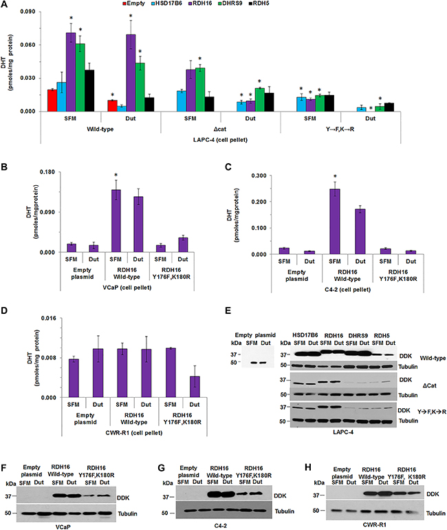 Figure 6: The combination of dutasteride and 3α-oxidoreductase mutants decreased DHT levels greater than dutasteride alone. The effect of dutasteride on DHT levels was determined in LAPC-4 cells that transiently overexpressed wild-type, Δcat or Y→F, K→R enzymes. (A) DHT levels were measured in VCaP, C4-2 and CWR-R1 cells transfected with empty plasmid or over-expressing plasmids of wild-type RDH16 or RDH16 Y176F,K180R (B–D). Western blot analysis using DDK antibody confirmed transiently expressed enzymes in LAPC-4, VCaP, C4-2 and CWR-R1 (E–H). Western blot images were cropped to conserve presentation space. Data were presented as mean +/- SEM. DHT was modeled as a function of treatment (dutasteride or SFM), enzyme (HSD17B6, RDH16, DHRS9 or RDH5) or empty plasmid, and plasmid type (wild-type, Δcat or Y→F, K→R) using a GLM. Mean DHT levels were compared between dutasteride and SFM treated LAPC-4 cells using one-sided Tukey-Kramer adjusted tests about the least-square means. Mean levels were compared among LAPC-4 cells that expressed HSD17B6, RDH16, DHRS9 or RDH5, or empty plasmid, for each 3α-oxidoreductase-treatment combination using Tukey-Kramer adjusted tests about the least square means. P-values were reported in Supplementary Table 10. *p < 0.05.