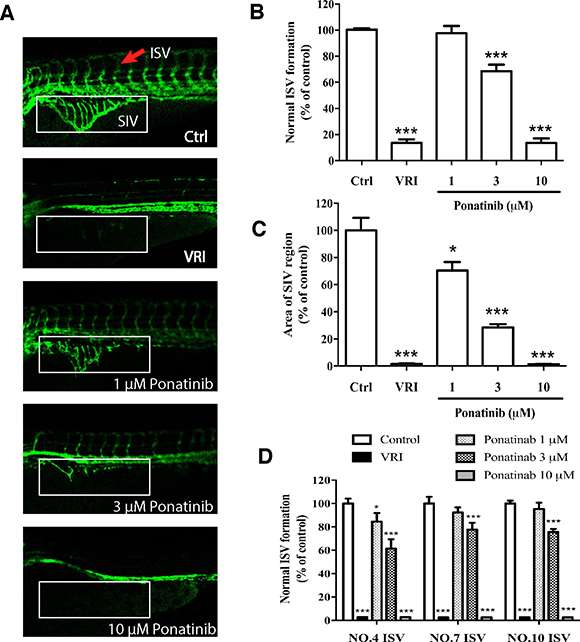 Figure 1: Effects of Ponatinib on vascular development of zebrafish larvae. (A) Fluorescent images of ISV and SIV in the zebrafish embryos incubated with 0.1% DMSO (Ctrl: vehicle-control), VRI (5 μM), and Ponatinib (1, 3 and 10 μM) for 48 h. VRI was used as the positive control. Red arrow: normal ISV. (B) Number of normal ISV with full-length formation. (C) Quantification of SIV area as a percentage of the control group. The total SIV area was determined by using the NIH image J program. (D) Formation of selected ISV (NO. 4, 7, and 10). All values are presented as means ± SD (n = 12). *P < 0.05 vs. control group, and ***P < 0.005 vs. control group.